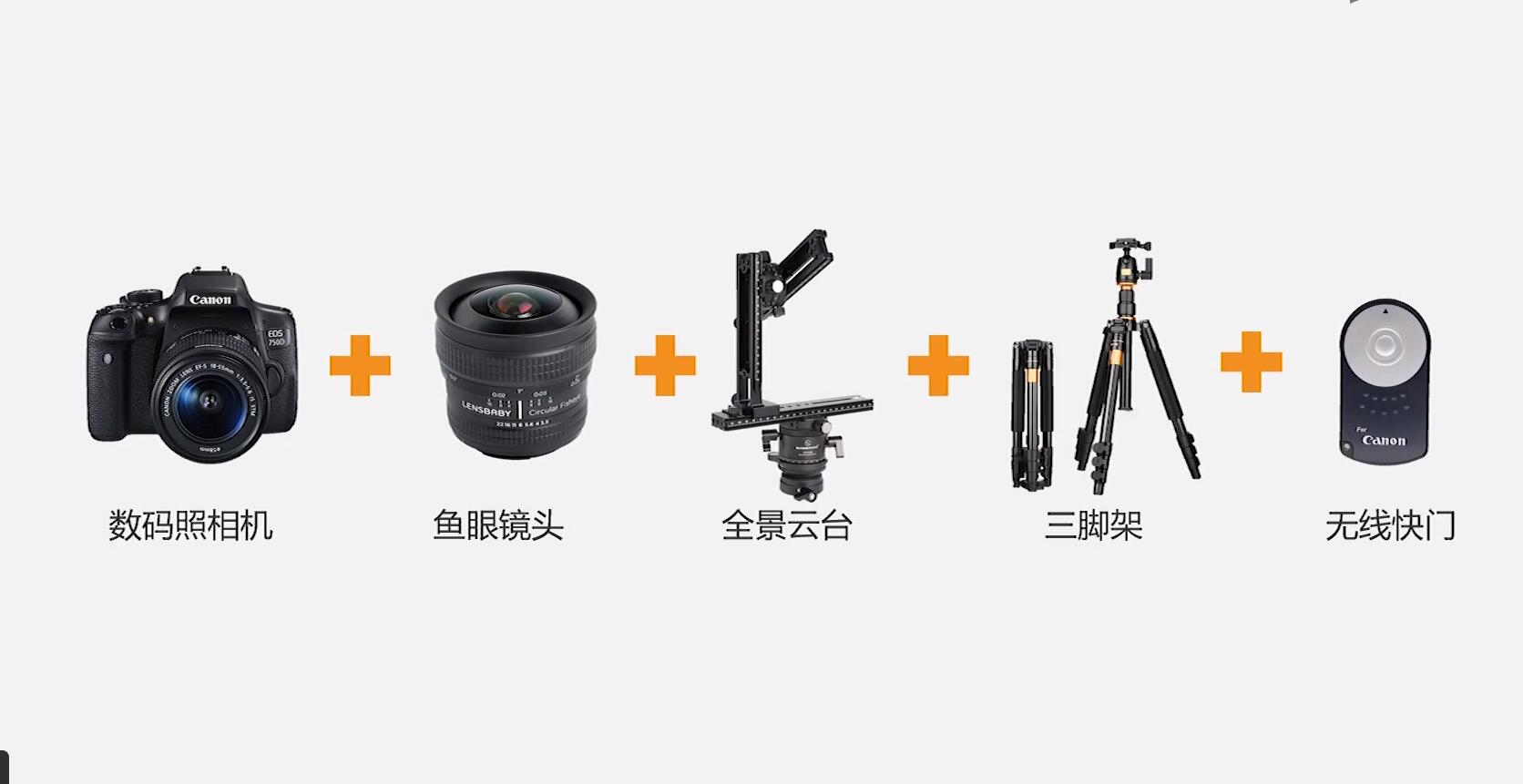用单反相机拍摄全景图片清晰度较高,能够满足商业需求。拍摄时主要需要以下设备,具体拍摄方法可自行网上查找相关内容进行自学。