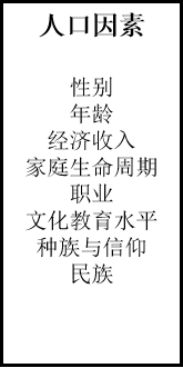 人口是构成市场最主要的因素,它与消费者的需求、购买特点及频率等关系密切。按人口因素细分市场还应考虑许多内容,这些内容主要包括性别、年龄、经济收入、家庭生命周期、职业、文化教育水平、信仰、民族及社会阶层等。