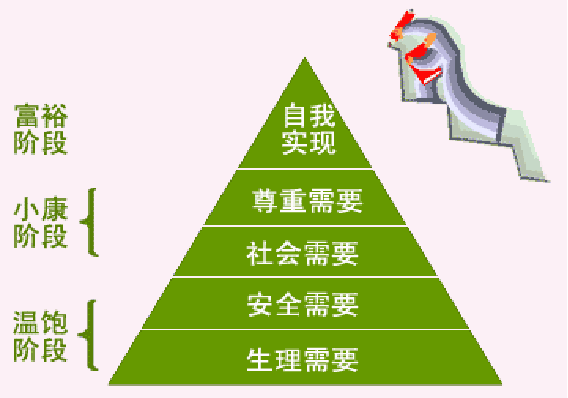 美国著名心理学家马斯洛提出的需求层次论,对分析消费需求有特殊的含义。马斯洛认为,人们在特定阶段其需求是不同的,这就构成不同的动机,由此他提出了著名的需求层次金字塔,如下图: