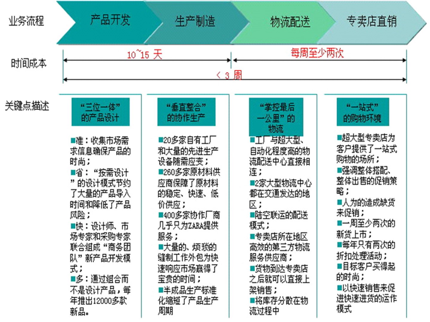 ZARA的拥有者——西班牙零售商INDITEX在快速时尚中可谓先锋。大多数零售商要好几个月才能把新产品推上市场,ZARA只要两个星期。ZARA的策略是并不领导时尚潮流,但紧跟潮流。它从大街上、电影里和其他名牌时装秀里吸取灵感,更新自己的产品 。