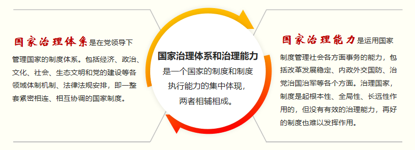国家治理体系是在党领导下管理国家的制度体系,包括经济、政治、文化、社会、生态文明和党的建设等各领域体制机制、法律法规安排,即一整套紧密相连、相互协调的国家制度;国家治理能力则是运用国家制度管理社会各方面事务的能力,包括改革发展稳定、内政外交国防、治党治国治军等各个方面。治理国家,制度是起根本性、全局性、长远性作用的,但没有有效的治理能力,再好的制度也难以发挥作用。同时,又不能把国家治理体系和国家治理能力等同起来,不是国家治理体系越完善,国家治理能力就越强。