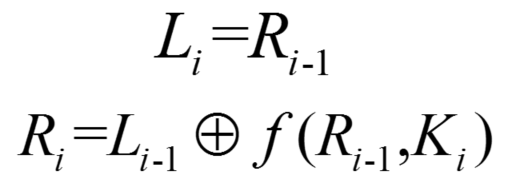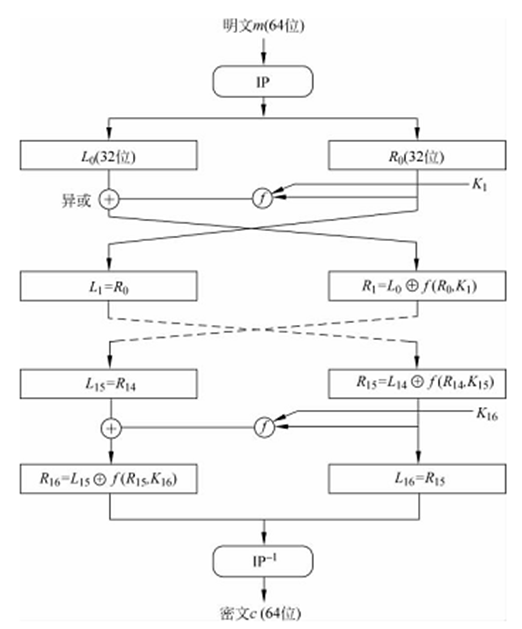 64位的明文m经初始置换IP后的64位输出分别记为左半边32位L0和右半边32位R0,然后经过16次迭代。如果用mi表示第i次的迭代结果,同时令Li和Ri分别代表m的左半边和右半边。