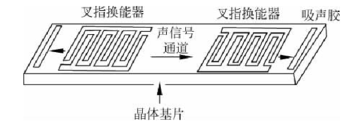 典型的声表面波器件结构原理图如图所示。电信号通过叉指发射换能器转换成声信号(声表面波),在介质中传播一定距离后到达接收叉指换能器,又转换成电信号,从而得到对输入电信号模拟处理的输出电信号。