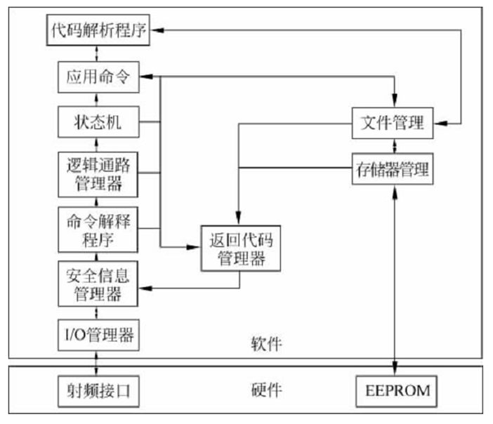 读写器向电子标签发送的命令,经电子标签的天线进入射频模块,信号在射频模块中处理后,被传送到操作系统中。操作系统程序模块是以代码的形式写入ROM的,并在芯片生产阶段写入芯片之中。操作系统的任务是对电子标签进行数据传输,完成命令序列的控制、文件管理及加密算法。