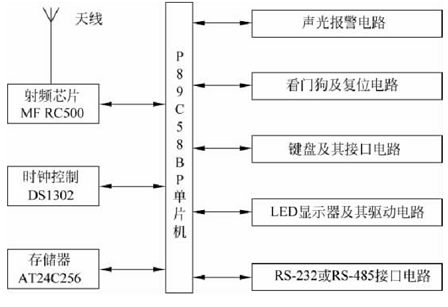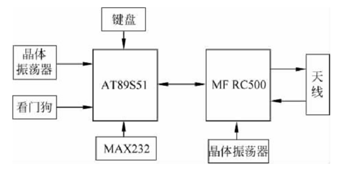 系统主要由AT89S51、MF RC500、时钟电路、看门狗、MAX232和矩阵键盘等组成。系统先由MCU控制MF RC500,驱动天线对MIFARE卡(也即电子标签)进行读写操作,然后与PC通信,把数据传给上位机。