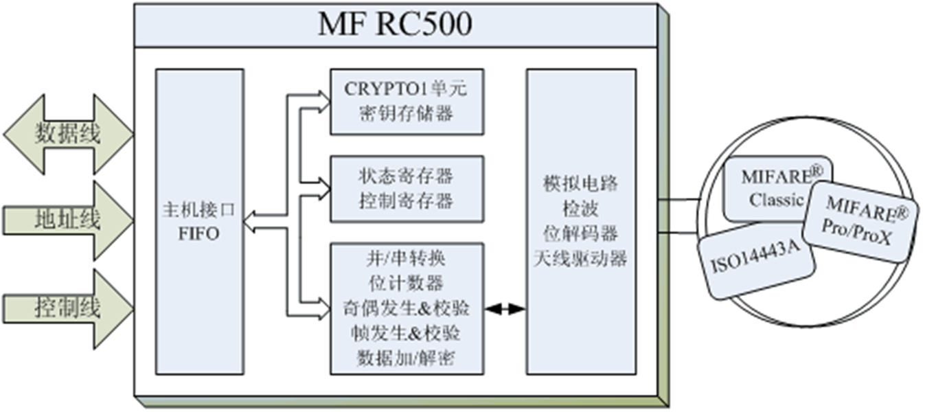 MF RC500支持ISO/IEC 14443 A所有的层,MF RC500还支持快速CRYPTOI加密算法,用于验证MIFARE系列产品。MF RC500的并行接口可直接连接到任何8位微处理器,给读卡器的设计提供了极大的灵活性。