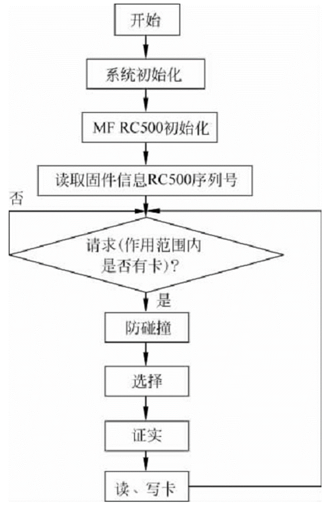 根据RFID原理和MF RC500的特性,可以设计基于P89C58BP和MF RC500的RFID读写器系统。该系统由MIFARE卡、发卡器、读卡器和PC管理机组成,其中,MIFARE卡存放身份号(PIN)等相关数据,由发卡器将密码和数据一次性写入。