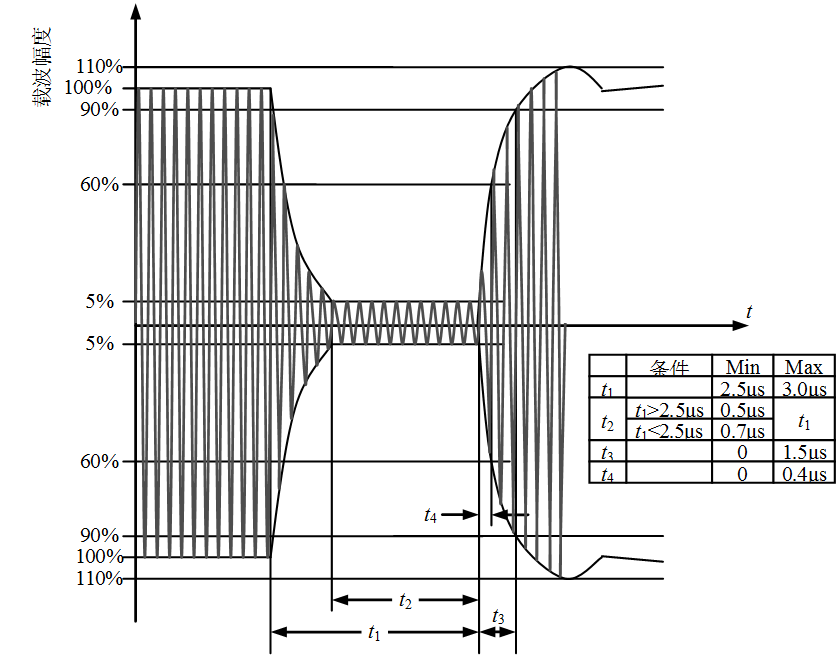 电子标签在发送命令前至少3位时内不得停止发送未调制载波。读写器在电子标签最后一个传输位结束后的第4个位时内发送命令帧的第一个下降沿。