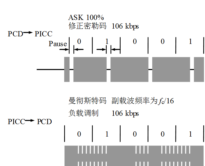 采用ASK调制,调制深度是11%或99%,位速率规定为l0kb/s或40kb/s,采用曼彻斯特编码。