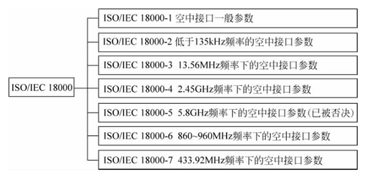 ISO/IEC 18000作为是目前相对较新的一系列标准,可用于商品的供应链,其中的部分标准也正在形成之中。其中,ISO/IEC 18000系列包含了有源和无源RFID技术标准,主要规定了基于物品管理的RFID空中接口参数。ISO/IEC 18000只规定了空中接口协议,对数据内容和数据结构无限制,因而可用于EPC。