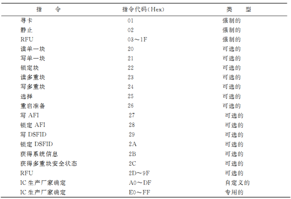ISO/IEC 15693标准共有4种指令类型:强制性的、可选的、自定义的和专用的。