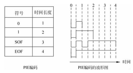 读写器发送的数据采用载波振幅调制,调制深度是30%(误差不超过3%)。数据编码采用脉冲间隔编码(Pulse Interval Encoding,PIE),即通过定义下降沿之间的不同宽度来表示不同的数据信号。