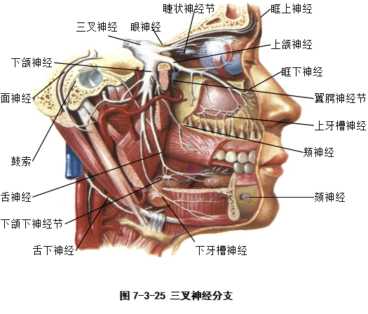 (3)三叉神经的三大分支:眼神经、上颌神经、下颌神经的分支;
