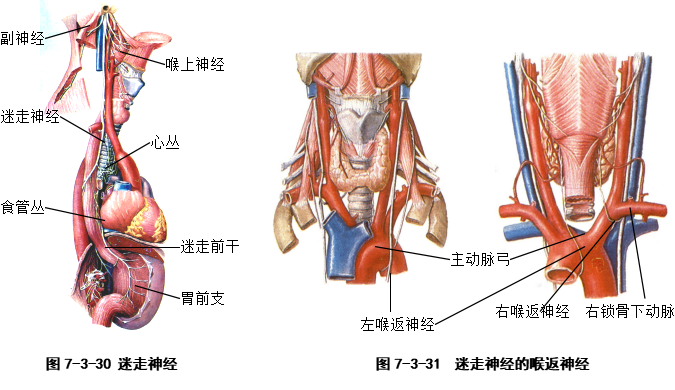 (5)迷走神经的喉上神经、喉返神经及副交感神经纤维的分布。