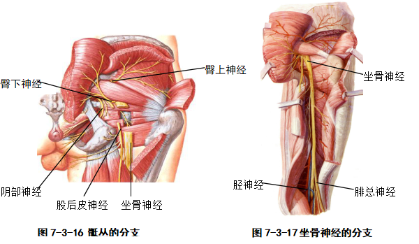 (6)骶丛组成、位置及主要分支坐骨神经、胫神经、腓总神经的分布。