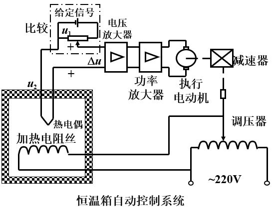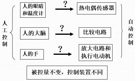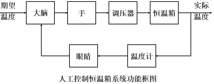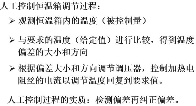 (1)人工控制恒温箱:控制温度,温度控制范围室温以上,加热丝加上隔热箱。温度计测保温箱温度。箱子热量泄露,用调压器调节电流大小。这是一个闭环的人工控制过程。