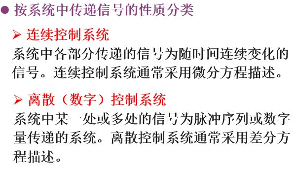 连续与离散系统:若系统的输入量和输出量都是时间连续函数,为连续系统。若系统中信号有为离散时间函数,则为离散系统。