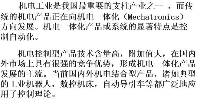 机电工业是我国重要支柱产业,控制自动化成为机电一体化产品或系统的显著特点。