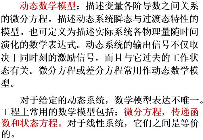 工程上常用的数学模型形式:微分方程、传递函数和状态方程。