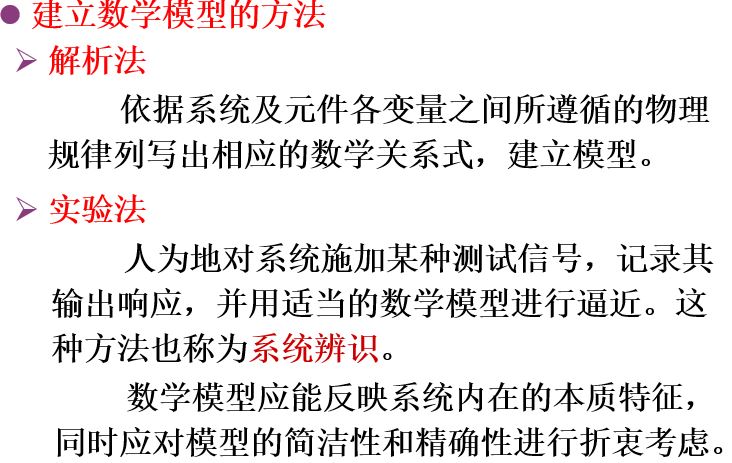 建立数学模型就是应用不同学科中的一些定律和基本原理,在建立数学模型过程中需解决模型的简化和模型的精度之间的矛盾。建立控制系统数学模型的方法主要有分析法和实验法,前者是依据物理或化学规律列写方程,后者是人为地给系统施加某种测试信号,记录其输出响应,并用适当的数学模型去逼近,又称为系统辨识。