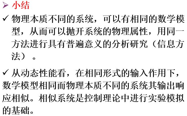 电气、机械、热力和流体等系统中,都存在相似系统,它们具有相似的时间响应解。由于存在相似系统及相似的解,分析人员可以将一个系统的分析结果,推广到具有相同微分方程模型的其他系统。所学的电气系统的知识,可以很快推广到机械、热力和流体等系统。