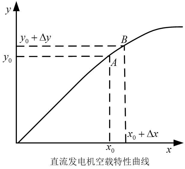 X轴表示励磁电流,Y轴表示输出电势。由于存在磁路饱和,y和x呈非线性关系y=f(x),可以在(x0,y0)附近泰勒级数。