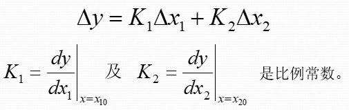 对于具有两个自变量的非线性函数y=f(x1,x2),在静态工作点y0=(x10,x20)附近展开成泰勒级数。