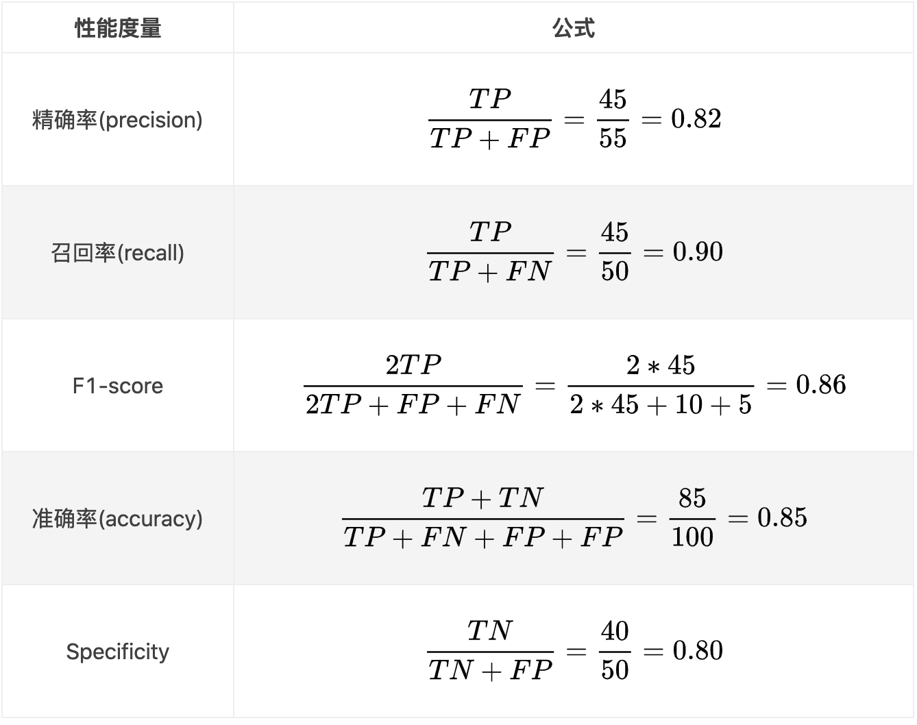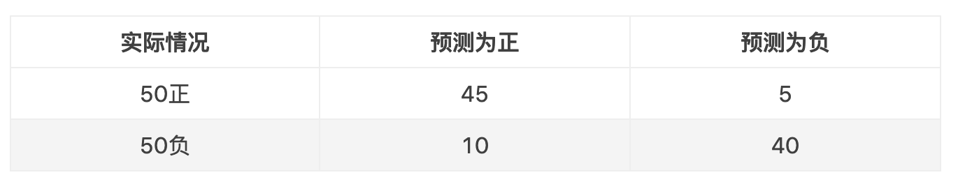 我们实际有50个样例,50个负样例,然后经过分类器分类之后。50个正样例中有45个预测为正样例(预测准了),5个被预测成为了负样例。50个负样例中(预测错误),有40个被预测为了负样例(预测准了),10个被预测为了正样例(预测错误)。