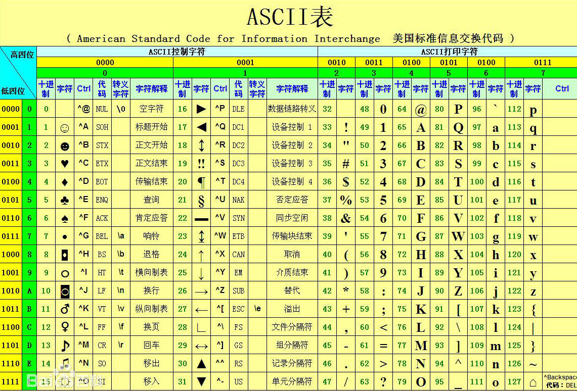 它用七位二进制码表示一个字母或符号,共能表示27=128个不同的字符。其中包括数字0~9、英文26个大、小写字母、运算符、标点及其他的一些控制符号。