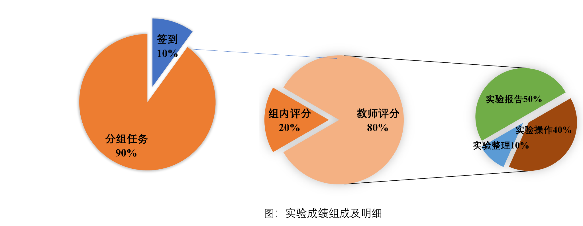 5.其他说明:实验报告以小组为单位提交,在学习通平台以分组任务的形式发放,在线评分,数据可视化,上传电子版实验报告,教师结合实验操作(课堂表现)、实验整理情况以及实验报告完成质量,给与百分制评分,教师评分占比80%,此外,需要组内成员根据组内合作和分工贡献值等给组内成员进行百分制评分,组内评分占总成绩20%,教师评分与组内评分共同构成学生的实验成绩。补充:实验课发布的课堂互动活动为个人加分项,直接计入实验总成绩,不参与分组任务评分。