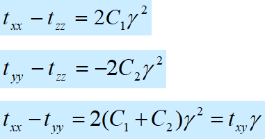 对非线性弹性是一个突破,它使我们不需作任何关于应力应变关系的假定而能得到非线性弹性的应力应变关系。当然这一理论比线弹性理论复杂得多。下面我们讨论的是一种特殊情况下的结果,即取W的级数展开式的头二项加以处理,我们称之为Mooney-Rivlin理论