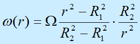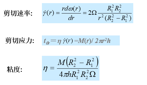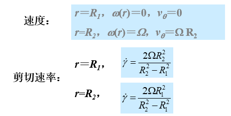 式中,h为内外圆筒的高度,设流体为牛顿型的,内圆筒固定,外圆筒以角速度W旋转,用柱坐标的动量方程,可推导出环隙内流体沿径向的周向速度,它为: