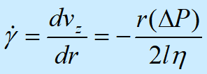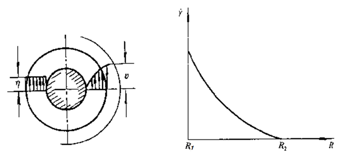 圆管中的层流流动的流速分布为一椭圆函数,而速度梯度即剪切速度则是r的线性函数。在圆管的轴心处vz具有最大值,而dvz/dr为零,在管壁处则相反,vz=0,而dvz/dr具有最大值