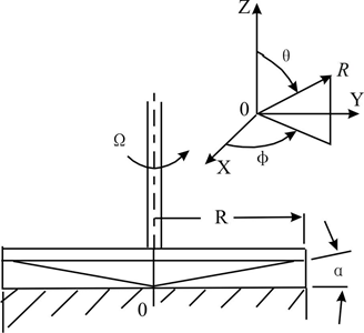 锥板流动发生在一个圆锥体与一个圆盘之间,圆锥与平板之间的夹角a很小,一般小于40。通常圆锥体以角速度W旋转,它的轴与圆盘垂直,也是圆锥体的旋转轴。圆锥体的顶点与圆盘平面接触