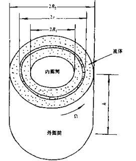 Couette流动,是指在外圆筒和内圆筒之间环形部分内的流体中的任一质点仅围绕着内外管的铀以角速度w(rad/s)作圆周运动,没有沿z或r方向的流动。w仅与r有关而与q和z无关,即