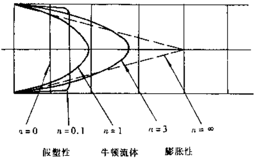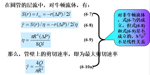 由上分析可见,对非牛顿流体的Poiseuille(圆管中的层流)流动,Hagen- Poiseuille方程应由式(6-13)代替。流速的分布也是椭圆分布,对假塑性的非牛顿流体,椭圆变平;而对膨胀性的非牛顿流体,则椭圆变尖。在极端情况下变为三角形