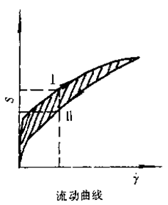 v触变性流体:如果连续地增大剪切速度,测定剪切应力S,以S对剪切速率作图。如下图中的升高曲线Ⅰ。再使剪切速率连续下降,测得下降曲线Ⅱ,但下降曲线并不与Ⅰ重合。两条曲线之间的面积定义了触变性的大小,它具有能量的量纲。阴影面积正是单位面积中凝胶结构被破坏的外界所作的功。