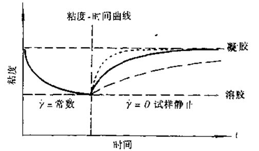 粘度随剪切的时间下降达到最低值(“溶胶”状态),静止后结构恢复,最后恢复到凝胶状态,但恢复需要的时间长得多