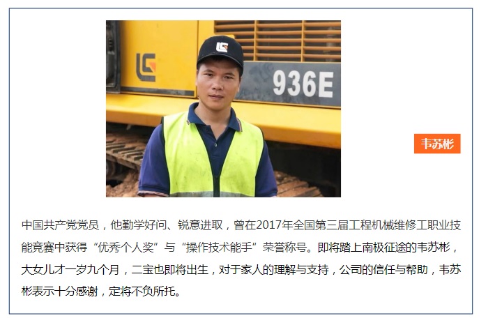 依极地中心要求,韦苏彬和廖育联将在中国极地研究中心参加行前培训,结束后与其他南极科考队员正式登船。韦苏彬、廖育联将分别奔赴南极科考中山站、长城站,开始为期1年5个月的科考任务。11月初,柳工在柳州、常州两个基地同步举行了出征欢送仪式。