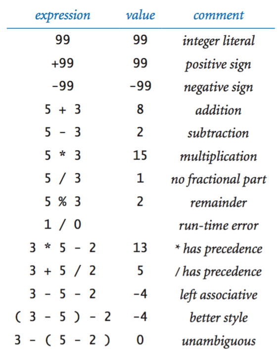 Integers. An int is an integer (whole number) between −231 and 231 − 1 (−2,147,483,648 to 2,147,483,647). We use ints frequently not just because they occur frequently in the real world, but also they naturally arise when expressing algorithms. Standard arithmetic operators for addition, multiplication, and division, for integers are built into Java, as illustrated in IntOps.java and the following table: (整数的运算,重点关注/和%,其他的无特殊)
