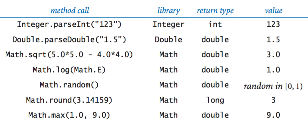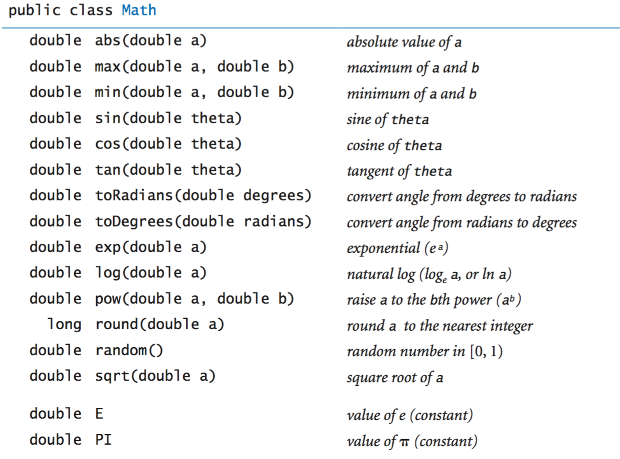 Many programming tasks involve using Java library methods in addition to the built-in operators. An application programming interface is a table summarizing the methods in a library. (API就是一系列的方法接口)