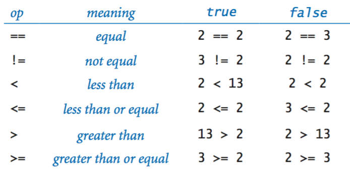 Comparisons. The comparison operators are mixed-type operations that take operands of one type (e.g., int or double) and produce a result of type boolean. These operations play a critical role in the process of developing more sophisticated(复杂的) programs.