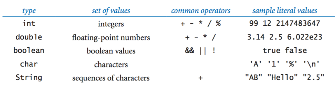 A data type is a set of values and a set of operations defined on them. (数据类型包括值和对应的操作符) For example, we are familiar with numbers and with operations defined on them such as addition and multiplication. There are eight different built-in types of data in Java, mostly different kinds of numbers. We use the system type for strings of characters so frequently that we also consider it here.