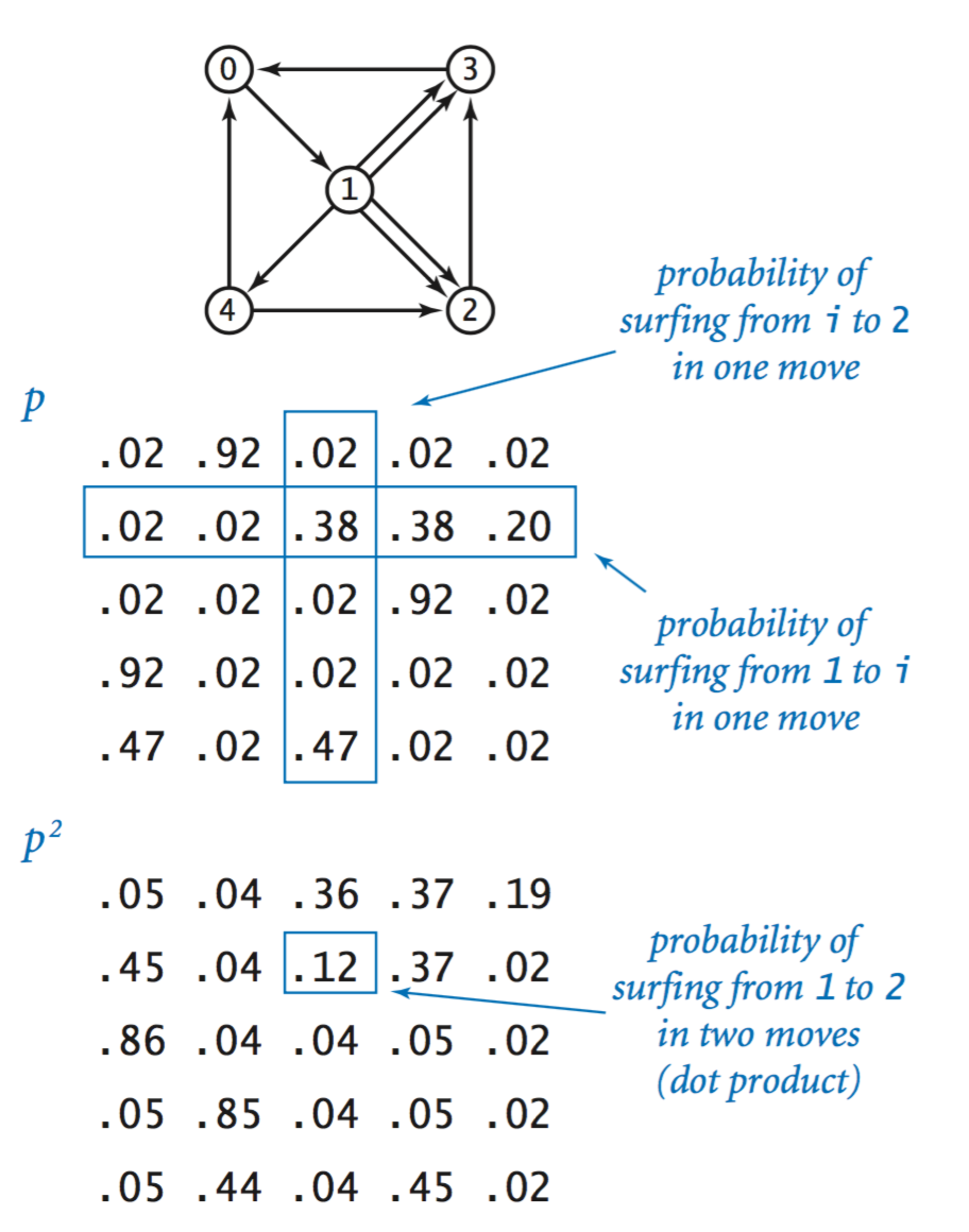 Squaring a Markov chain. What is the probability that the random surfer will move from page i to page j in two moves? The first move goes to an intermediate page k, so we calculate the probability of moving from i to k and then from k to j for all possible k and add up the results. This calculation is one that we have seen before—matrix–matrix multiplication.