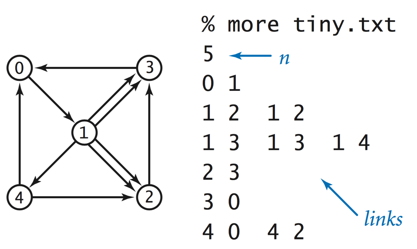 We assume that there are n web pages, numbered from 0 to n−1, and we represent links with ordered pairs of such numbers, the first specifying the page containing the link and the second specifying the page to which it refers. The input format we adopt is an integer (the value of n) followed by a sequence of pairs of integers (the representations of all the links).
