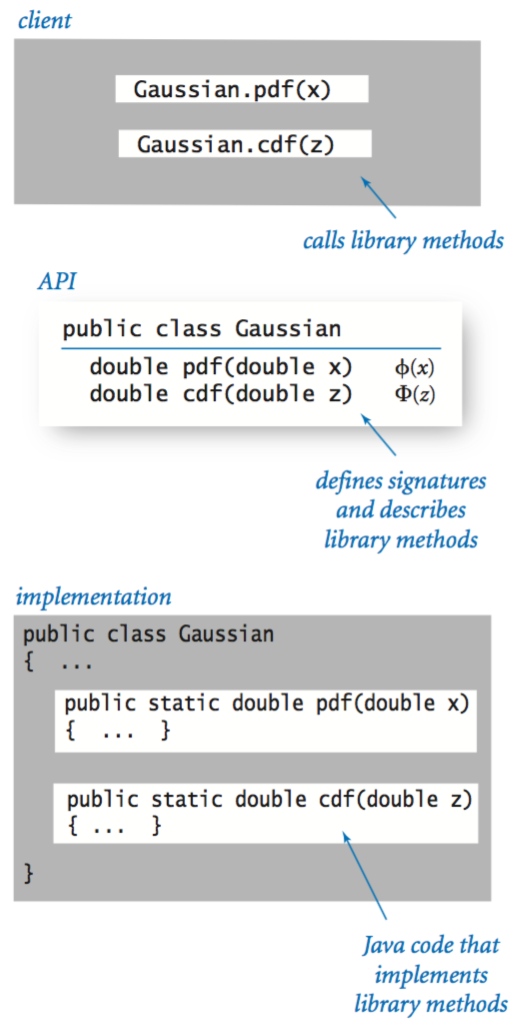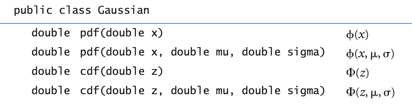 As an example, Gaussian.java is an implementation of the following API: