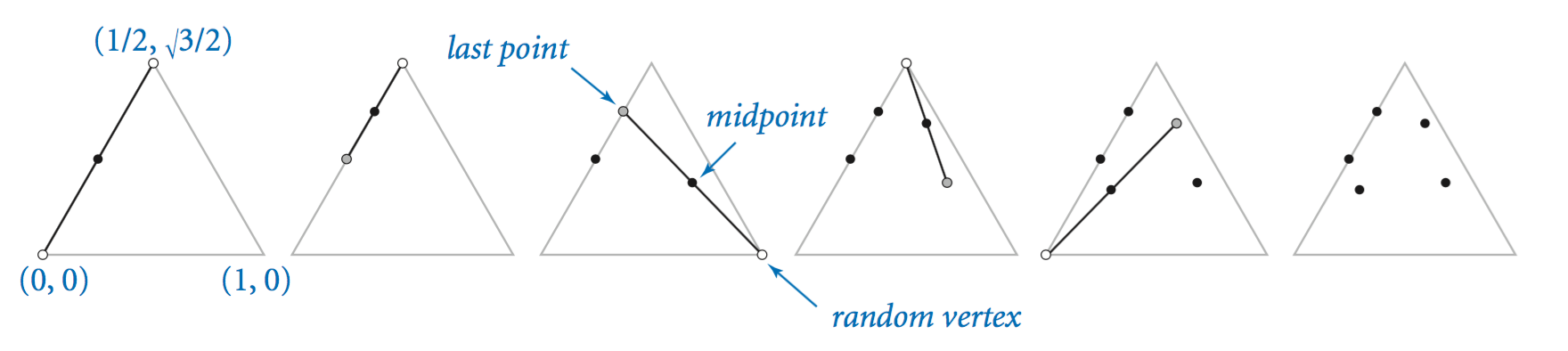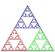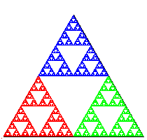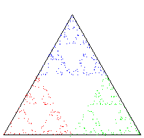 An Iterated function system (IFS迭代函数系统) is a general way to produce fractals(分形) like the Sierpinski triangle or Barnsley fern. As a first example, consider the following simple process: Start by plotting a point at one of the vertices of an equilateral triangle. Then pick one of the three vertices(顶点) at random and plot a new point halfway between the point just plotted and that vertex. Continue performing the same operation.