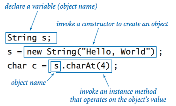 Creating objects. Each data-type value is stored in an object. When a client invokes a constructor, the Java system creates (or instantiates) an individual object (or instance). To invoke a constructor, use the keyword new; followed by the class name; followed by the constructor’s arguments, enclosed in parentheses and separated by commas.