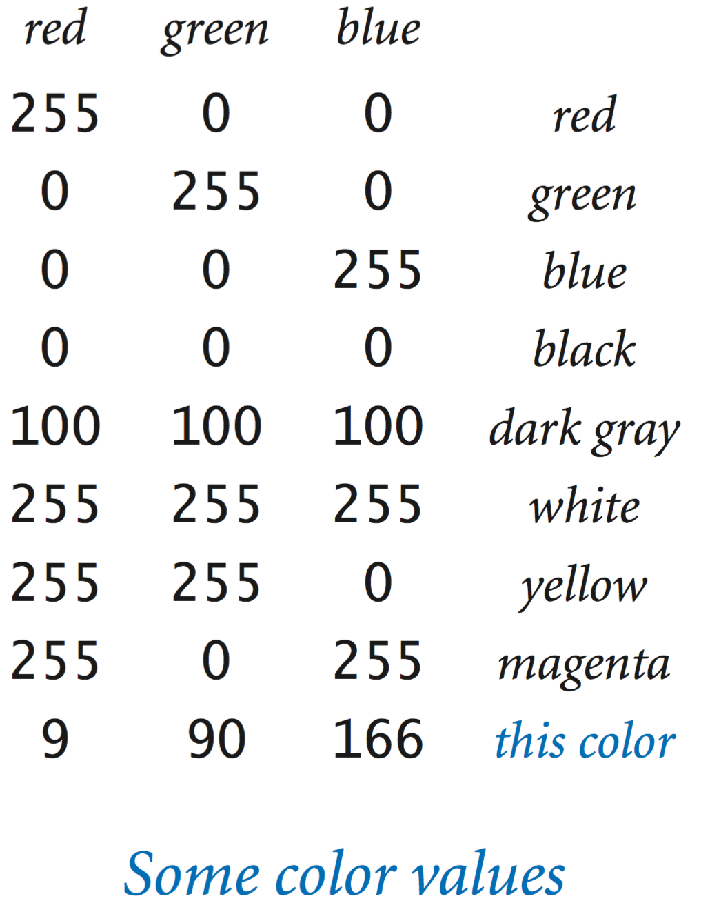 Color red = new Color(255, 0, 0); Color bookBlue = new Color( 9, 90, 166);