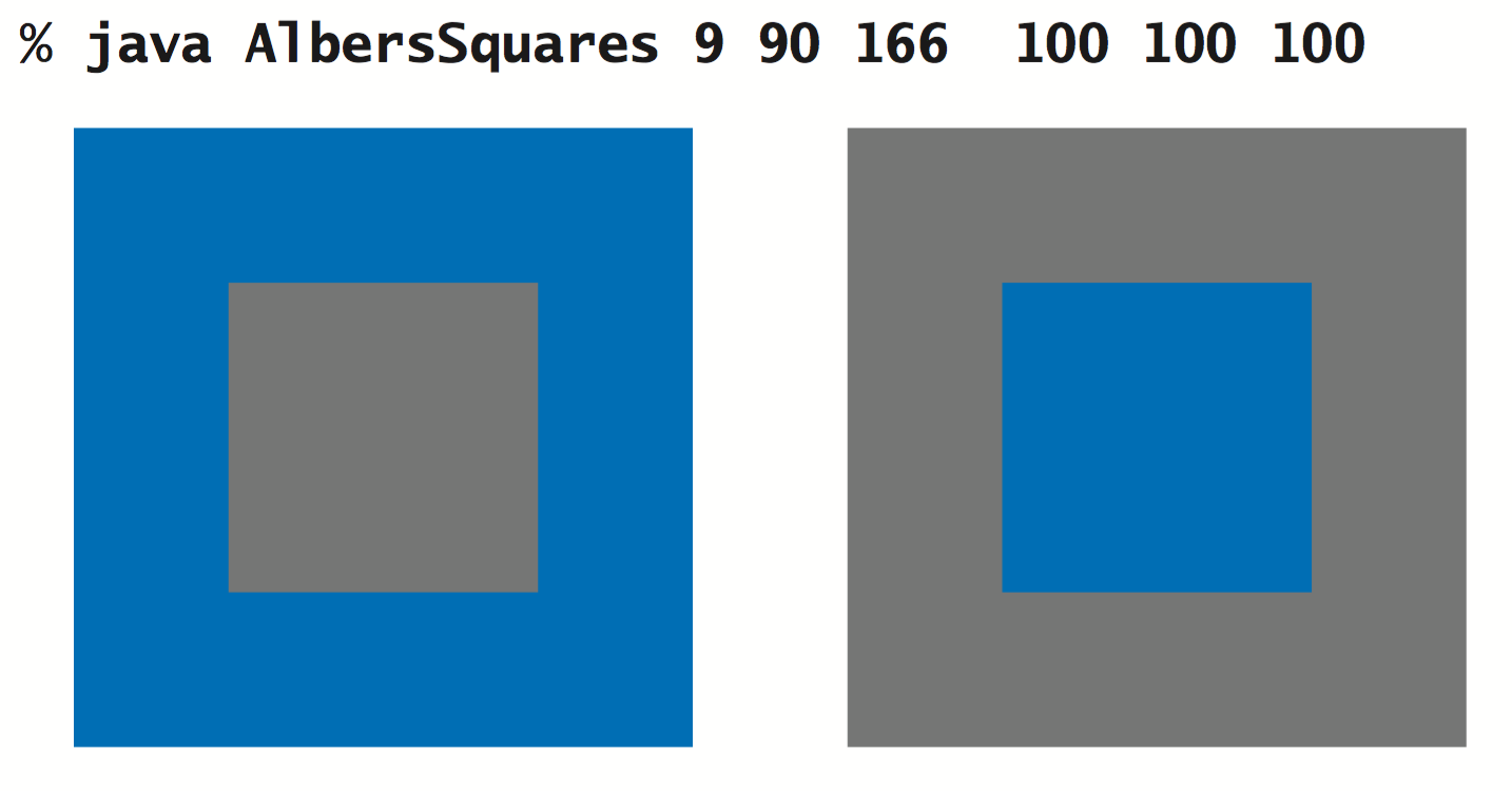 Albers squares. AlbersSquares.java displays the two colors entered in RGB representation on the command line in the format developed in the 1960s by Josef Albers that revolutionized the way that people think about color.